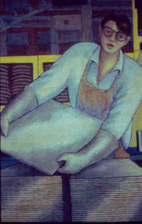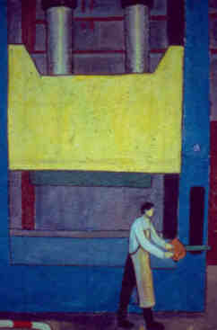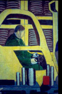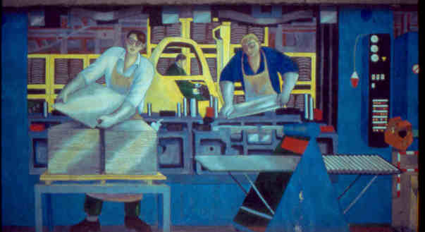 Auf diesen Wandbildern werden Arbeitssituationen bei der Firma John Deere, Mannheim künstlerisch umgesetzt. Die Wandbilder wurden 1991 von Bibiena Houwer auf einer Fabrikmauer der Firma John Deere realisiert. Sie existieren heute nicht mehr. |