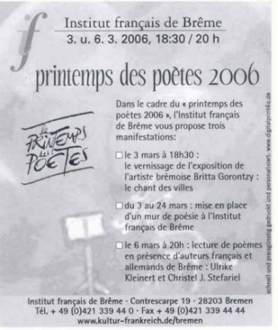 La poétesse allemande Ulrike Kleinert est née en 1955 dans un petit village proche de Brême. Elle est la directrice pédagogique d’un jardin d’enfants. Ses poèmes empruntent les chemins de la ville de Brême, s’ouvrent sur le paysage intérieur des êtres qui y vivent en nous faisant entrer dans leur intimité et mettent en évidence les beautés et les travers de notre société. Elle a à son actif plusieurs recueils de poésie, un livre pour enfants et se consacre à l’écriture d’un roman. Vient d’être décerné conjointement à Ulrike Kleinert et Peter Holz, écrivain et poète, linguiste à l’université de Brême, le prix littéraire Bremer Autorenstipendiums 2006. Le nouveau recueil de poèmes d’Ulrike Kleinert DIE STADT, DIE ZEIT, DIE LIEBE paraîtra début mai 2007. |